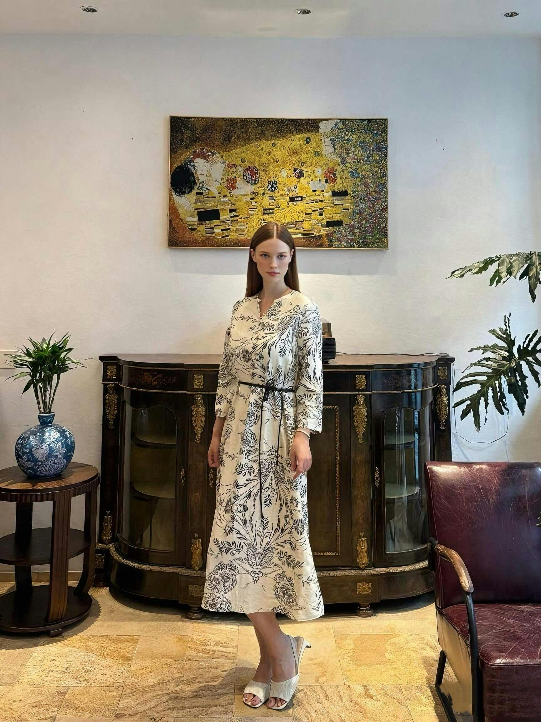 Botanical Noir Belted Midi Dress