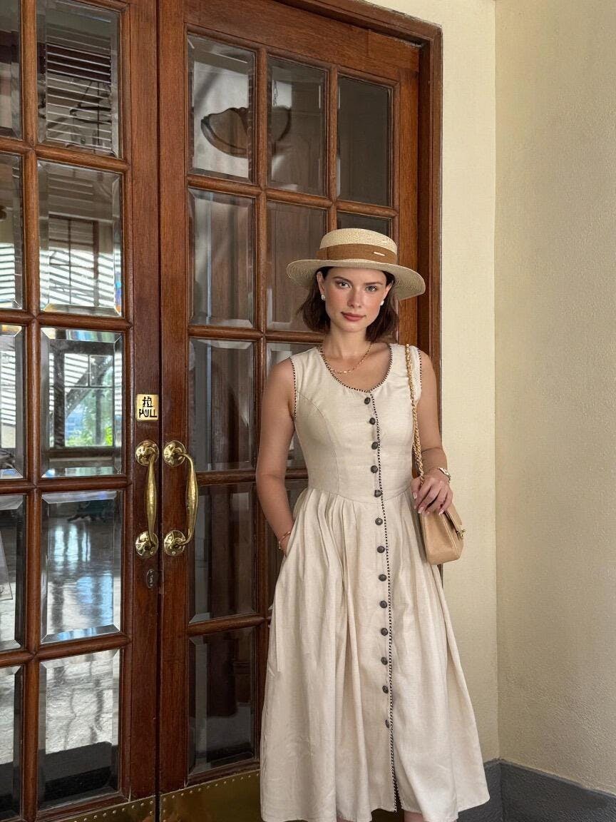 ✧ Travel Tip: Perfect for countryside escapes or coastal strolls. The cotton-linen blend stays crisp in warm air and folds easily in a suitcase — just unroll and button up.