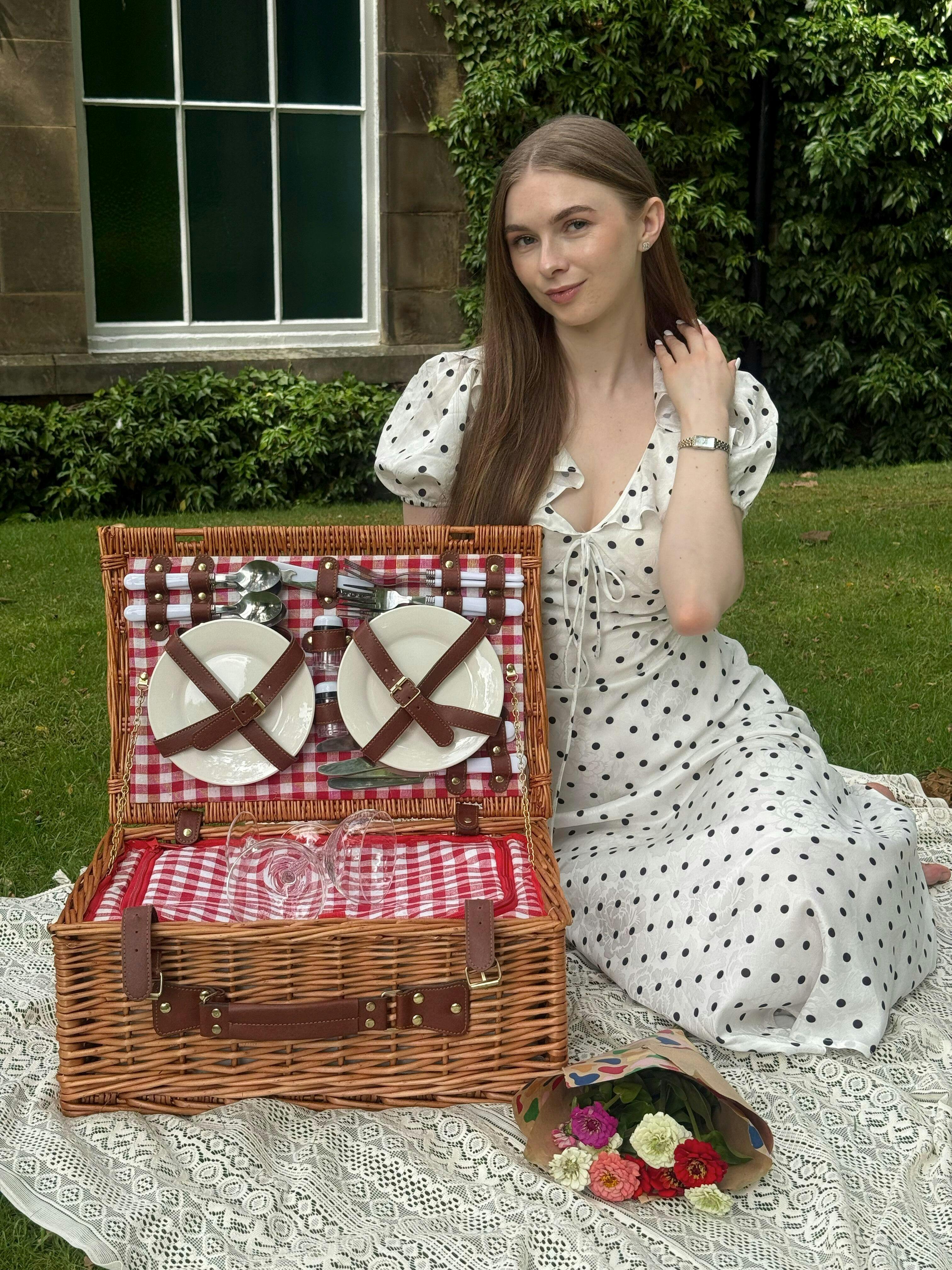 - Vintage-inspired black polka dot print