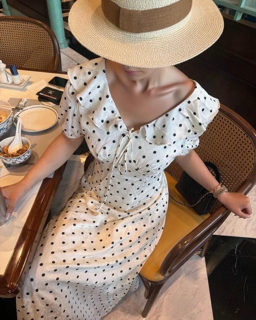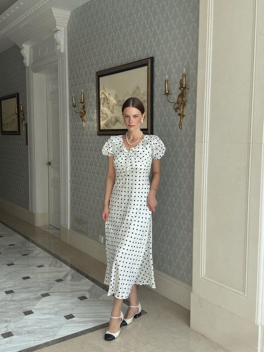 Dotted with charm and framed with a flutter — this dress captures the sweet nostalgia of quiet elegance.