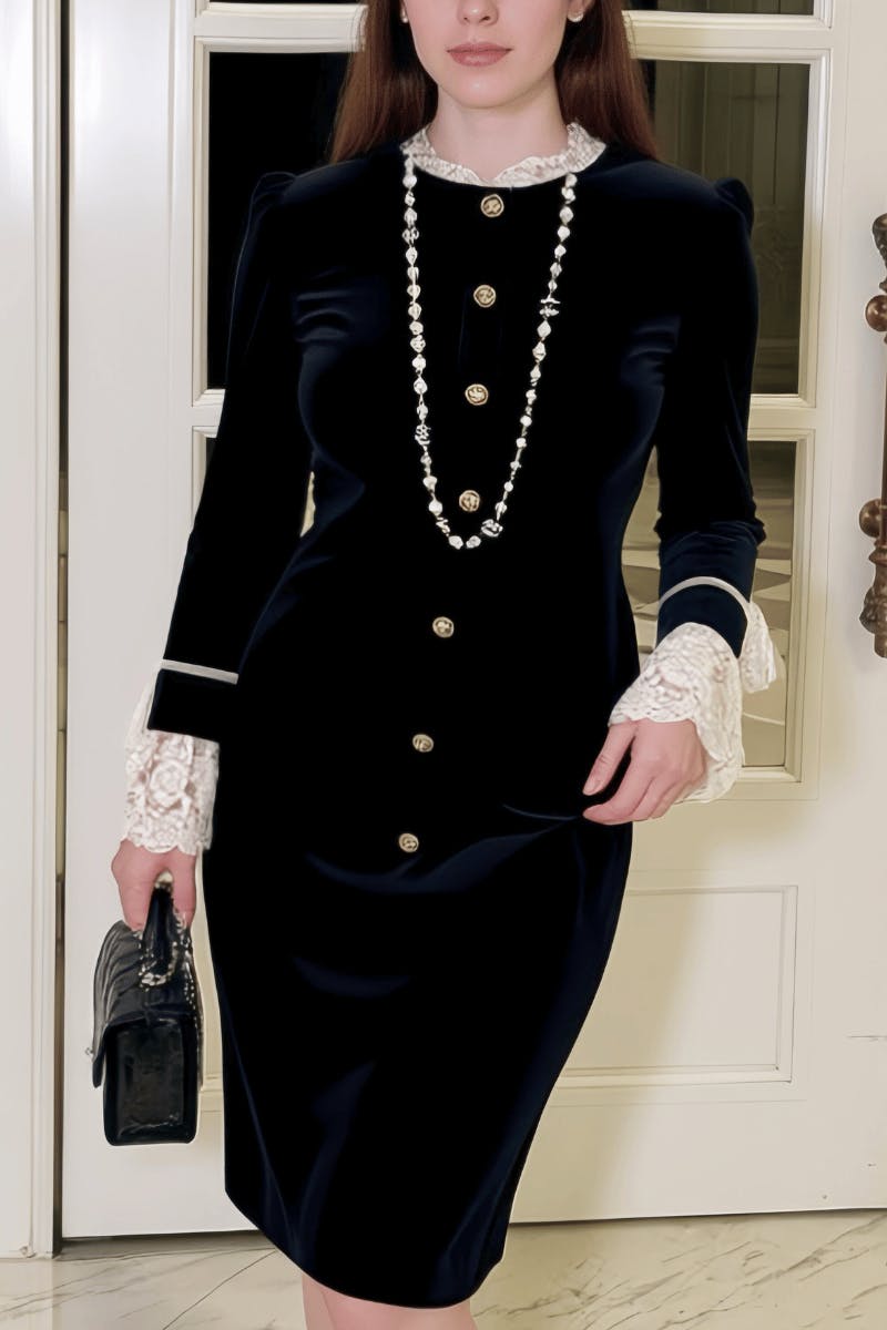 Velvet with pearl and lace detailing — sumptuous yet wearable, perfect for candlelit dinners or winter celebrations.