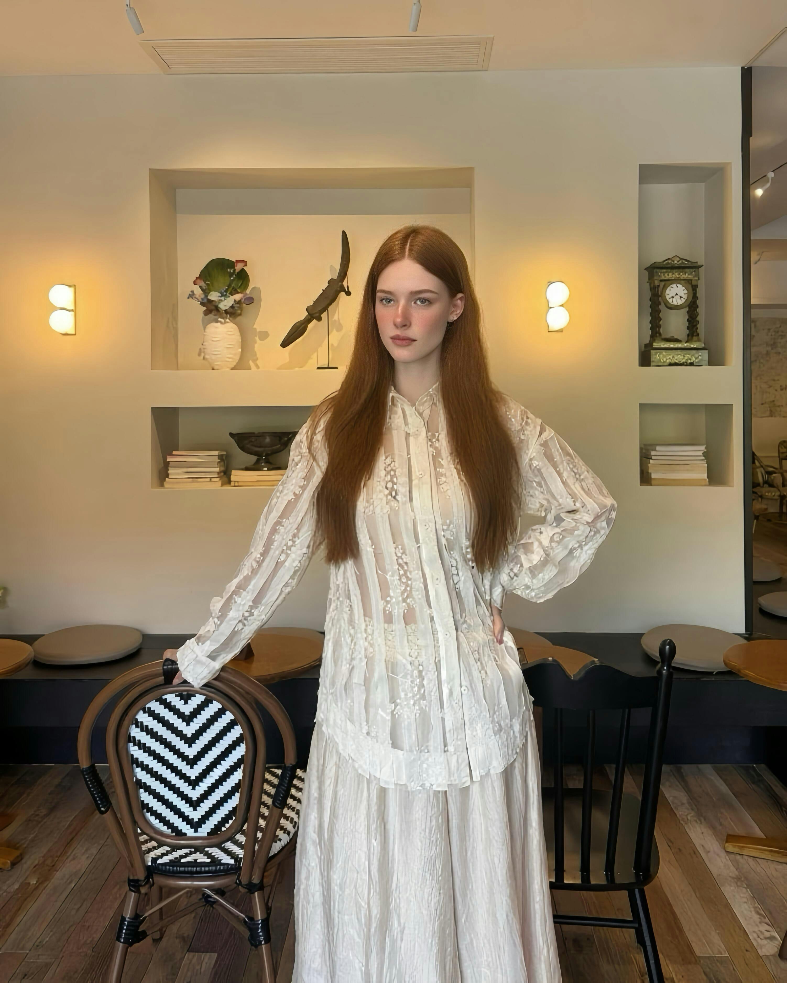 Crafted from airy organza with embroidered blooms and translucent stripes — dreamy enough for dusk, elegant enough for brunch.